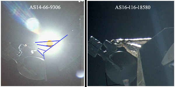 | Was genau die Sonne verdeckt ist in den Apollo14-Fotos selbst nicht zu sehen. Als Vergleichsfotos bieten sich AS16-116-18580 und AS17-140-21370 an, die die Mondfähre aus einer ähnlichen Perspektive zeigen. Daraus ergibt sich, dass die Sonne durch eine Halterungsstrebe der S-Band Antenne verdeckt ist. Wenn auch die genaue Position hinter der Strebe nur schwer zu ermitteln ist, am wahrscheinlichsten ist, dass nur winzige Kreissegmente der Sonnenscheibe oben und unten herausschauen. |