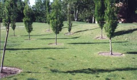 Bild 1 zeigt zwei vom Betrachter wegführende Reihen von Bäumen.